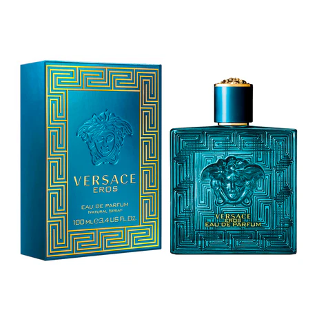 Versace Eros es una fragancia fougère oriental que combina intensidad y frescura con un perfil vibrante. Su salida mezcla menta, manzana verde y limón italiano. En el corazón, se encuentran el geranio, la salvia y el ambroxan, aportando una estructura aromática con matices modernos. La base incluye vainilla de Madagascar, vetiver, musgo de roble, cedro de Virginia y cedro del Atlas, creando un fondo cálido y envolvente. El frasco azul turquesa con detalles dorados y el emblema de Medusa expresa fuerza, lujo y seducción.